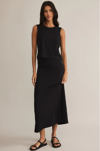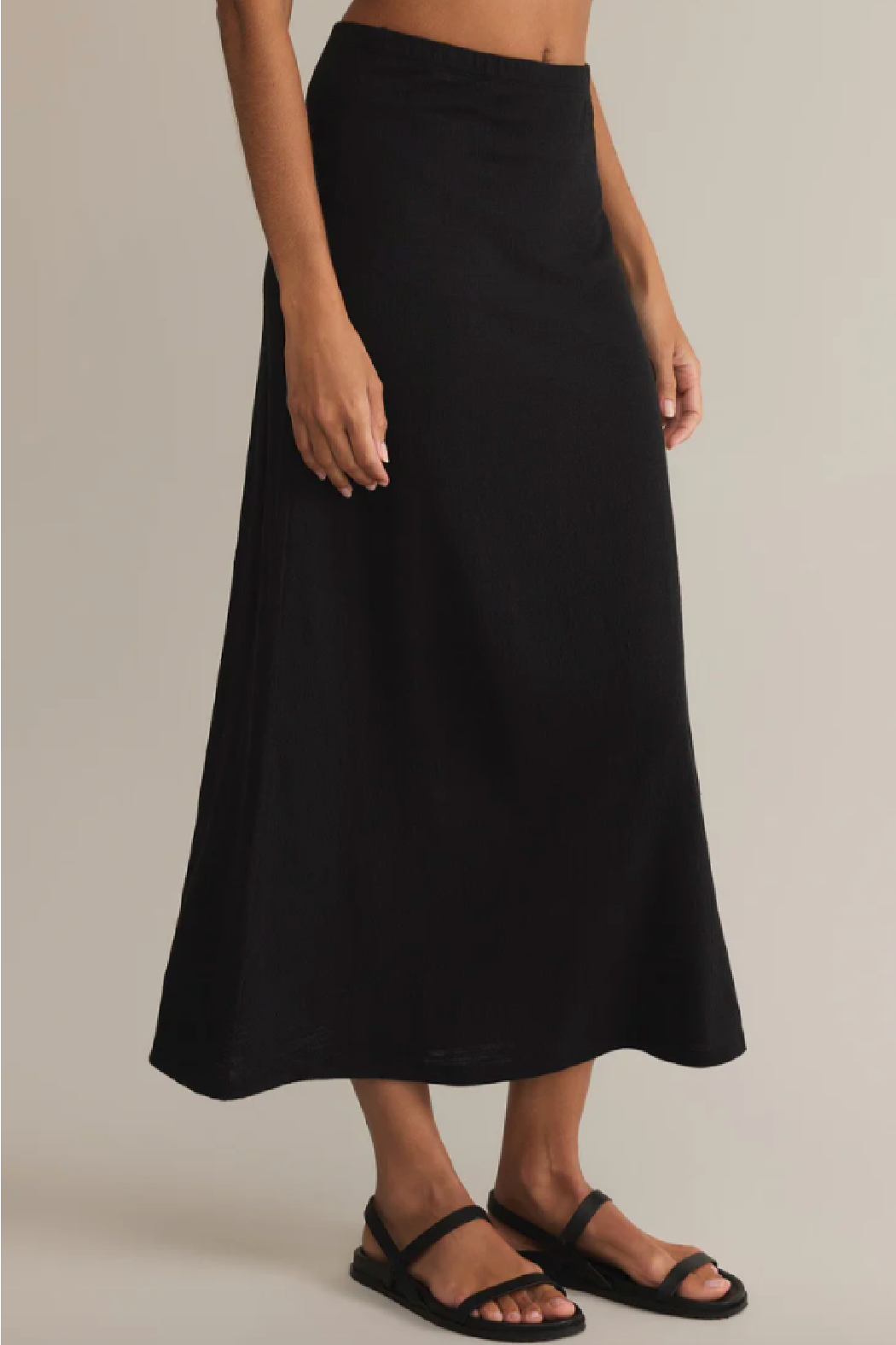 Relaxed and versatile, this mid-rise midi skirt features an elastic waistband and textured slub knit fabric for a laid-back vibe. Mid weight and easy to style, it’s the ultimate piece for effortless layering.