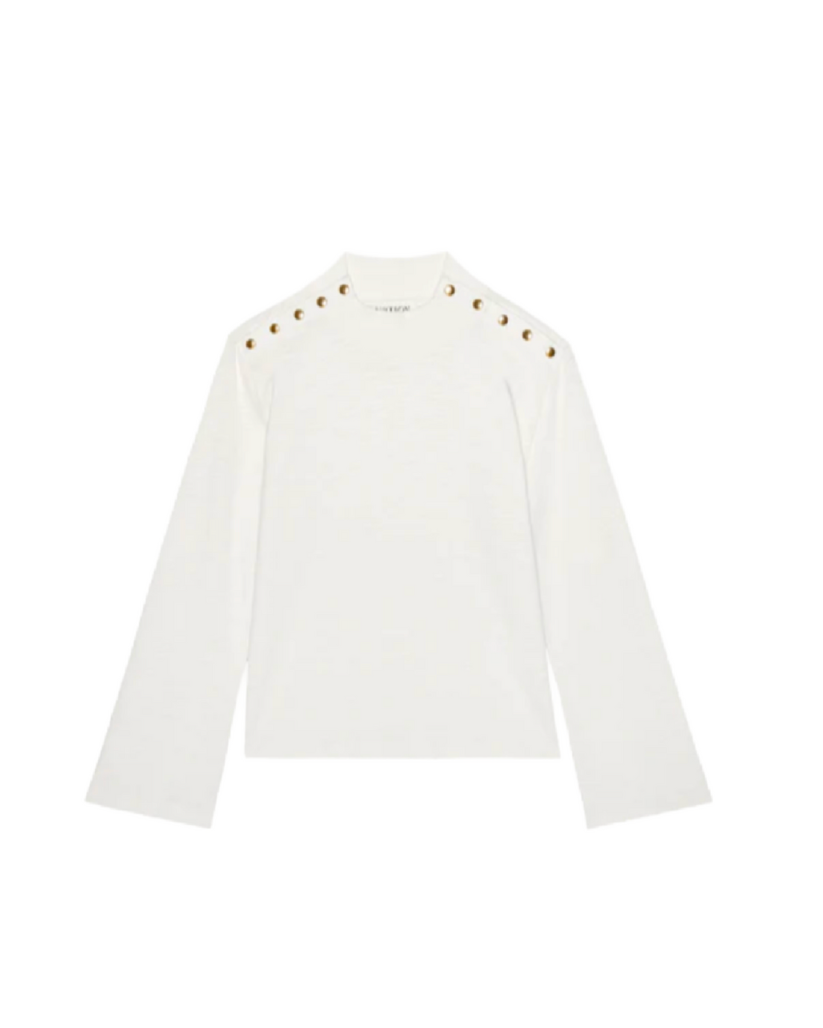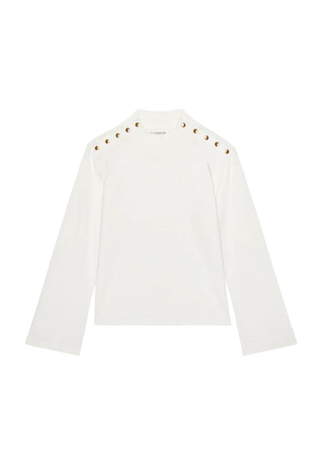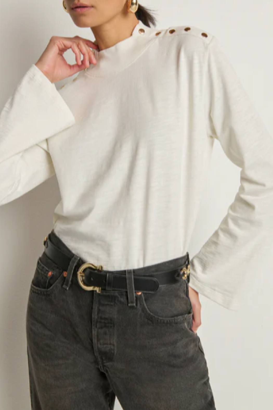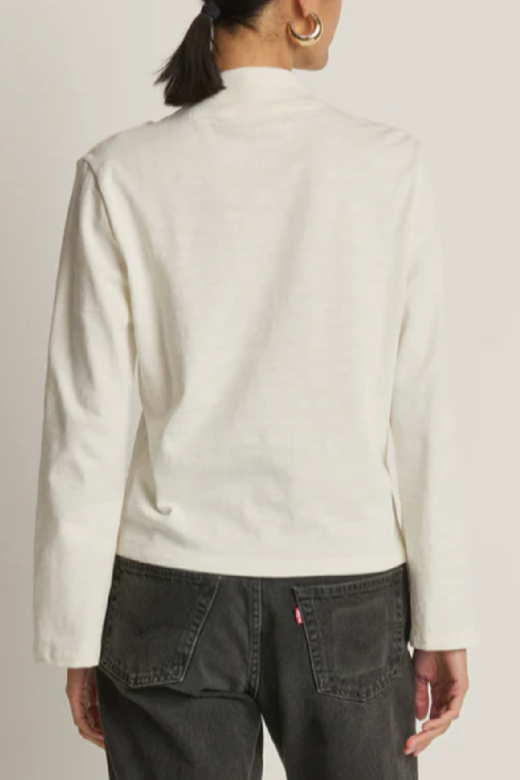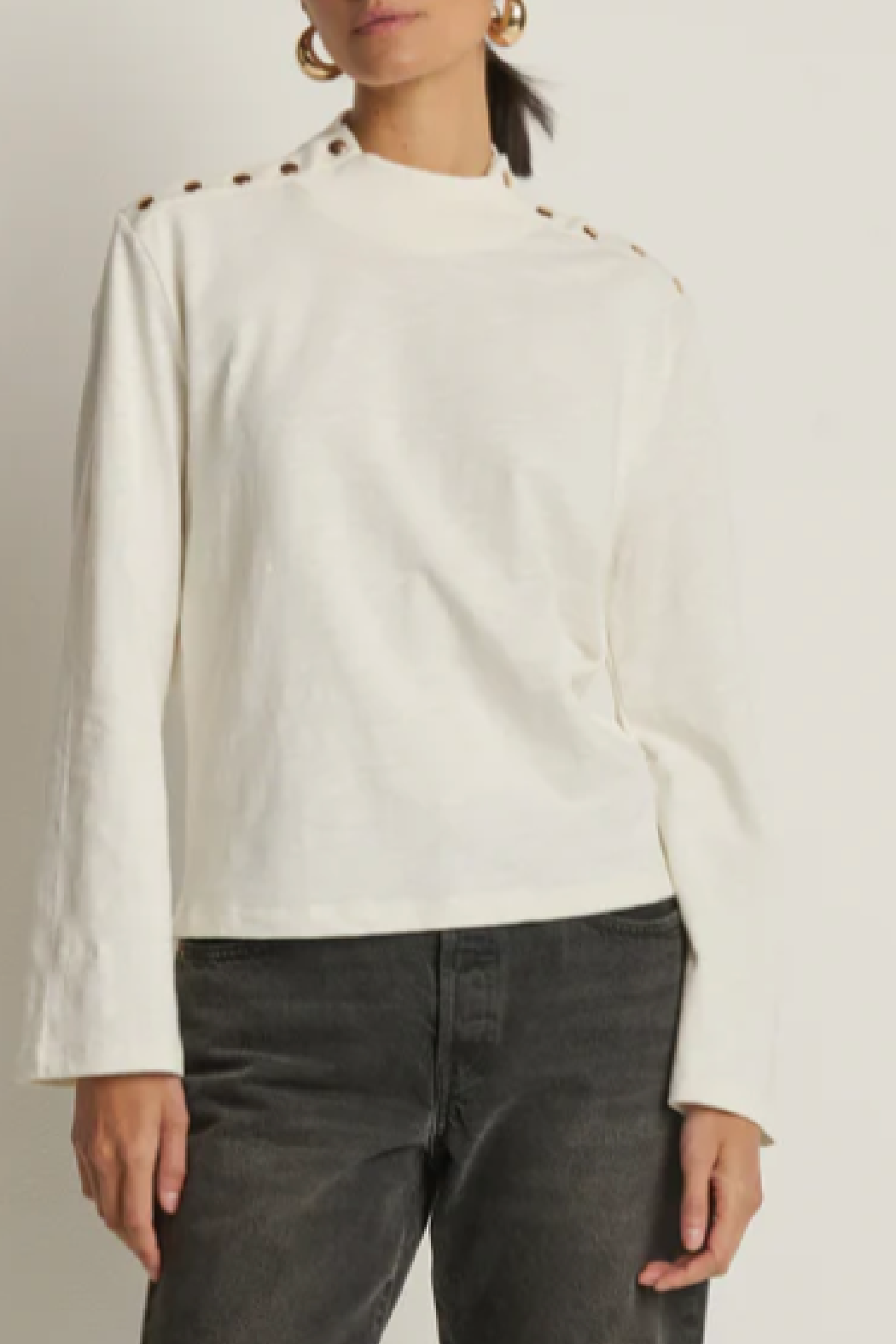 The Neda Long Sleeve effortlessly blends style and comfort—crafted with a relaxed, cropped boxy shape. Its chic mock neck, cozy bell sleeves, and shiny gold accents add a stylish twist to this everyday essential.